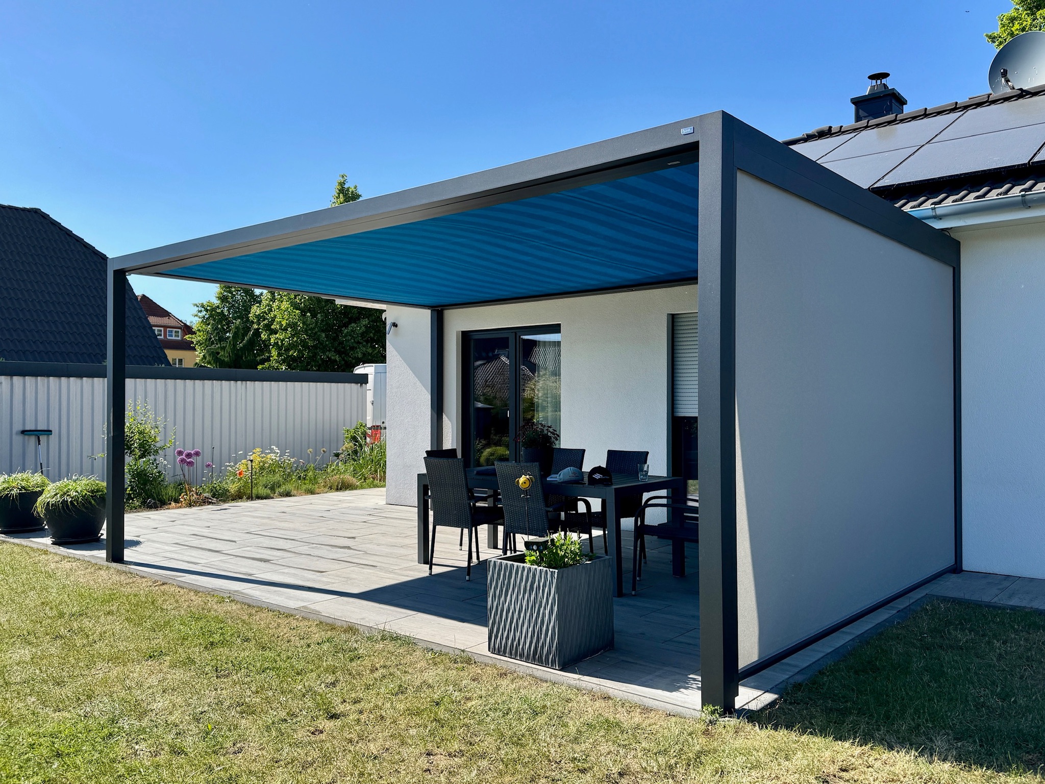 Senkrechtmarkise an der Frontseite sowie eine seitliche Beschattung sind möglich