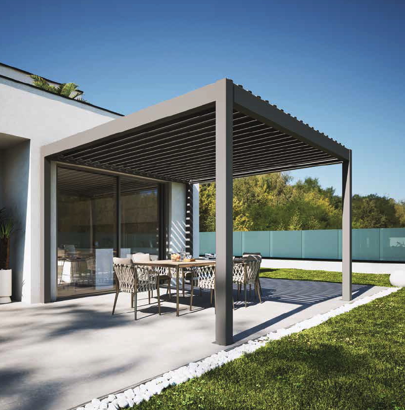 Unsere bioklimatische Pergola für stilvollen Outdoor-Komfort – Mit nur einer Geste lassen sich die Lamellen drehen und bieten gezielte Kontrolle über Sonnenlicht, Hitze und Luftzirkulation.