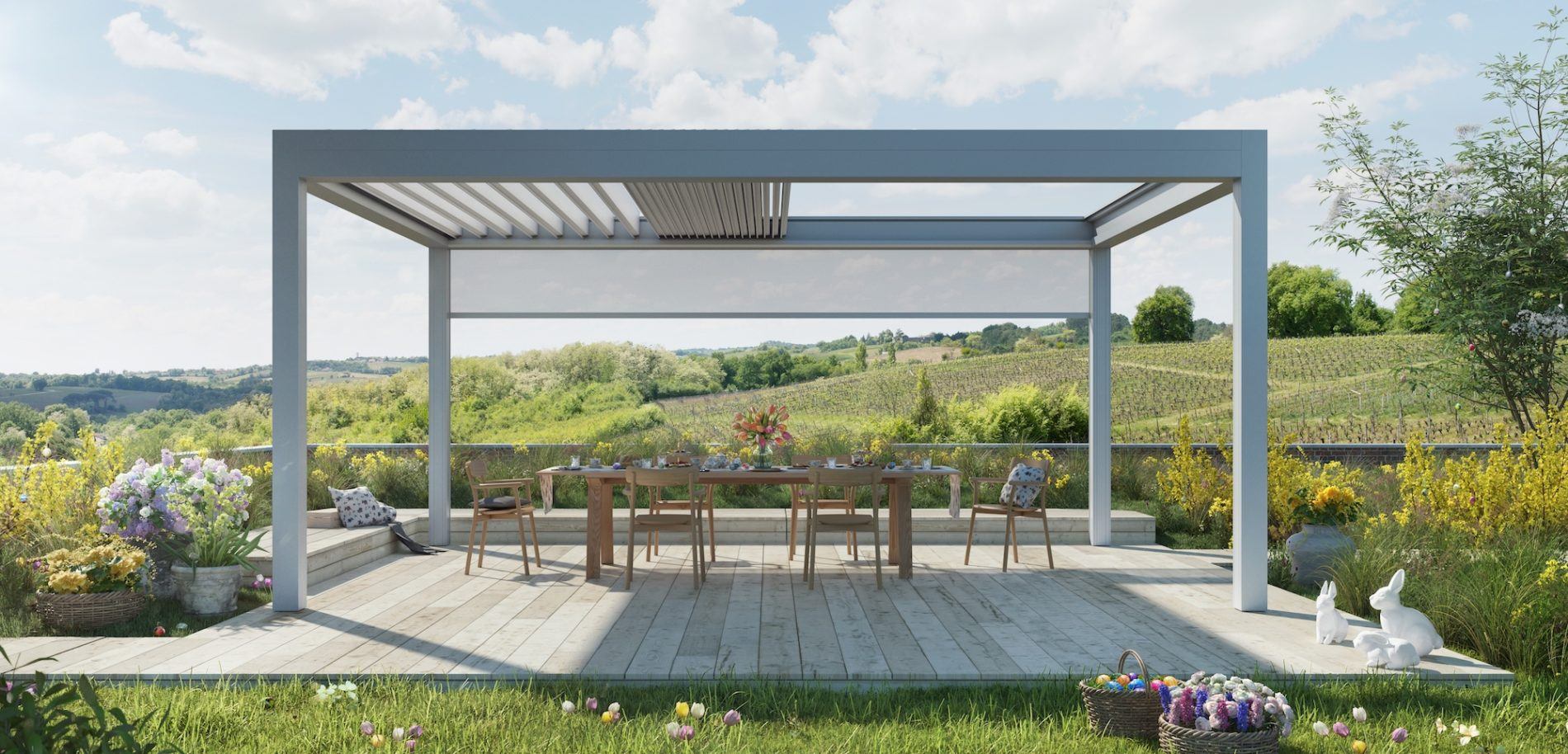 Die Terrassenüberdachung mit dreh- und einfahrbaren Dachlamellen sorgt für Cabrio-Feeling auf Ihrer Terrasse
