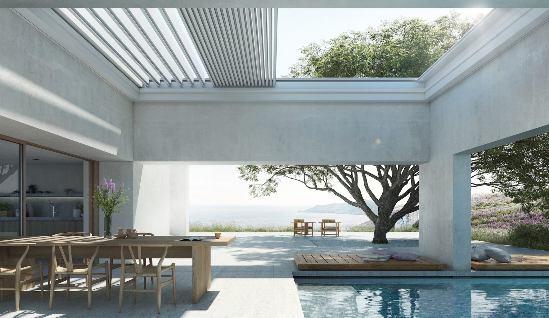 Und die Dachlamellen können darüber hinaus eingefahren werden was für maximalen Sonnengenuss und eine endlose Sicht sorgt. In geschlossenem Zustand ist das Dach perfekt flach mit minimalem Spielraum zwischen den Lamellen.