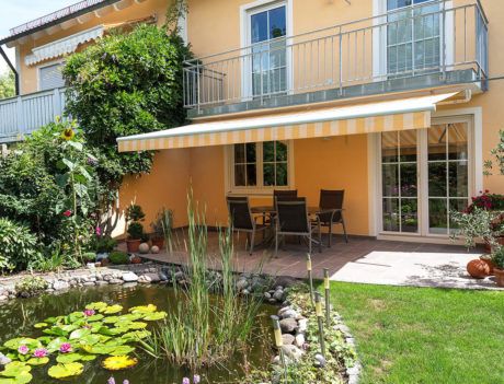 Offene Gelenkarmmarkise mit vielen Gestaltungsmöglichkeiten: Zum Beispiel mit einem zusätzliches Regendach als Basisschutz für die Tuchrolle oder in Spezialformat mit mehr Länge als Breite.