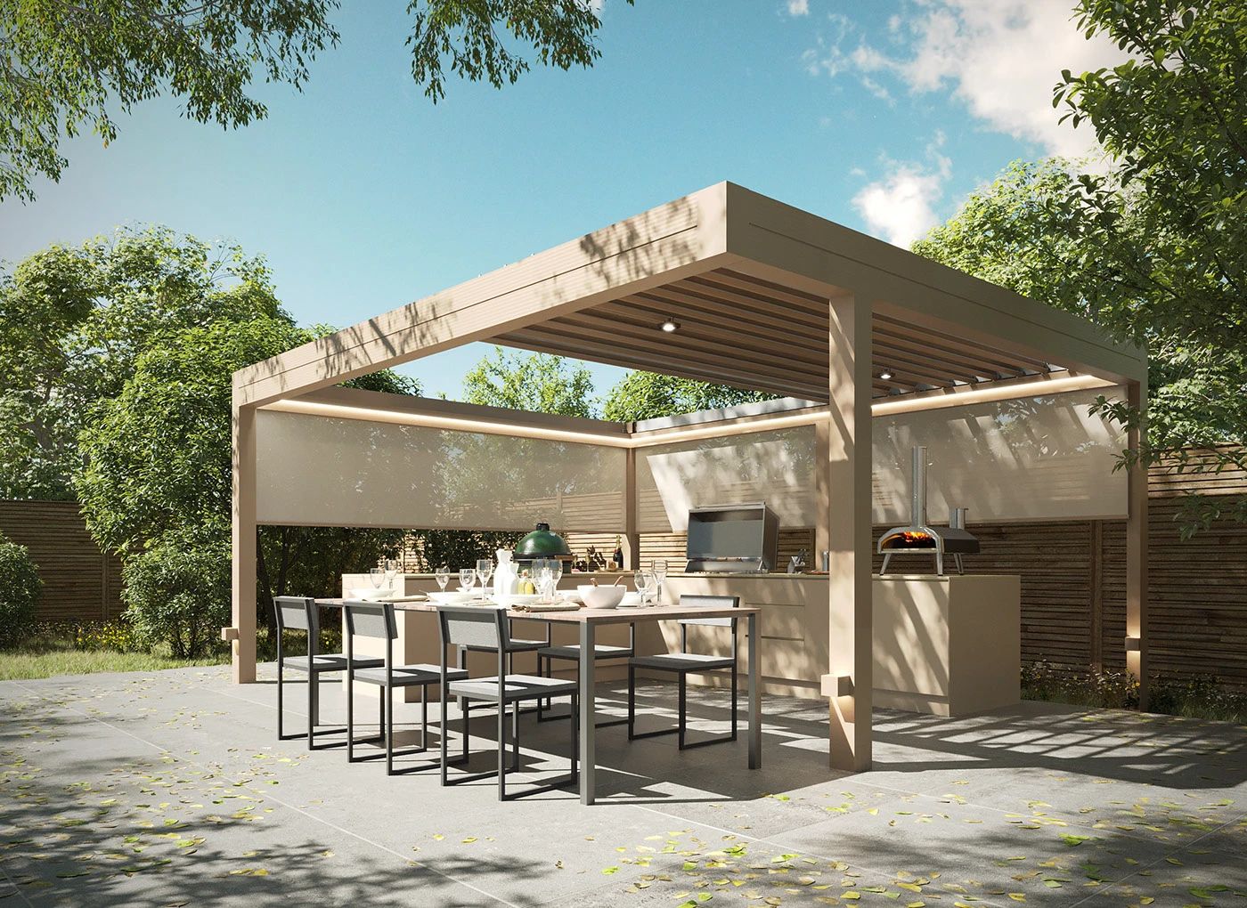 Die Outdoor-Küche ist Herzstück und Bühne zugleich. Ob BBQ, Pizzaofen, Spülbecken oder Kühlschrank – moderne Systeme lassen keine Wünsche offen. Die Küche wird perfekt auf den überdachten Bereich abgestimmt, sodass Funktionalität, Wegeführung und Design nahtlos ineinandergreifen.