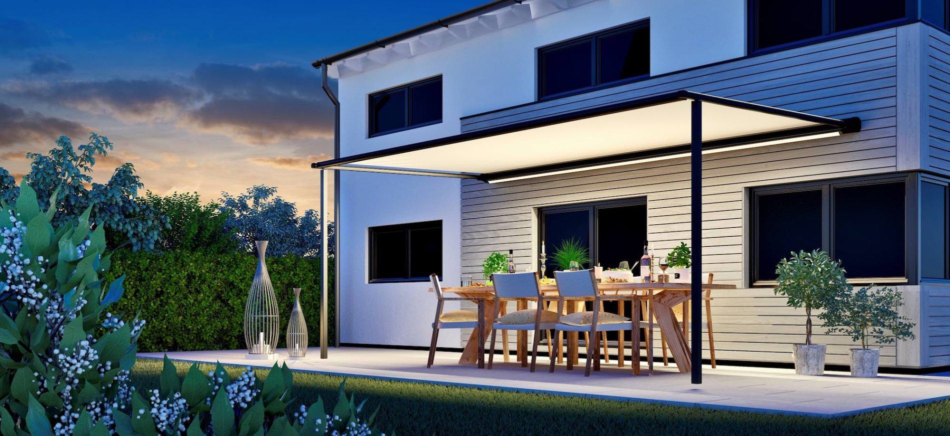 PERGOLAMARKISE: DER ERFOLGSSCHLAGER IM BEREICH BESCHATTUNG, SONNEN- UND WINDSCHUTZ. MODERNE ARCHITEKTUR UND MAXIMALE FUNKTIONALITÄT DURCH INTEGRIERTE SENKRECHTMARKISE
