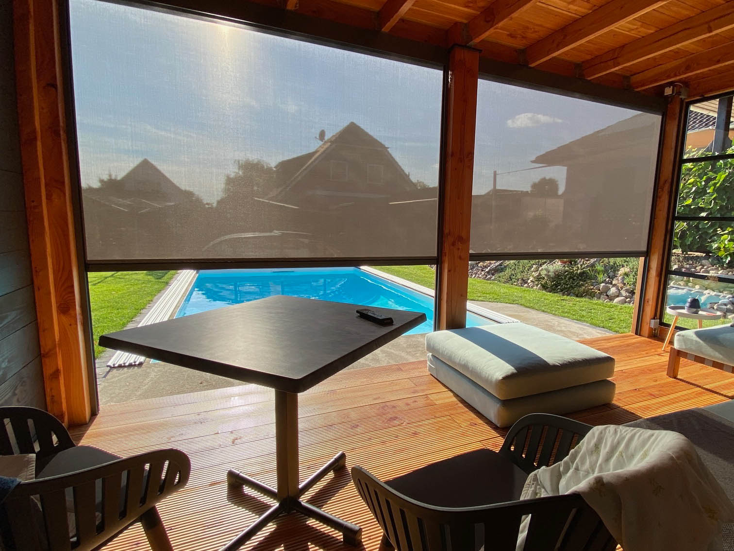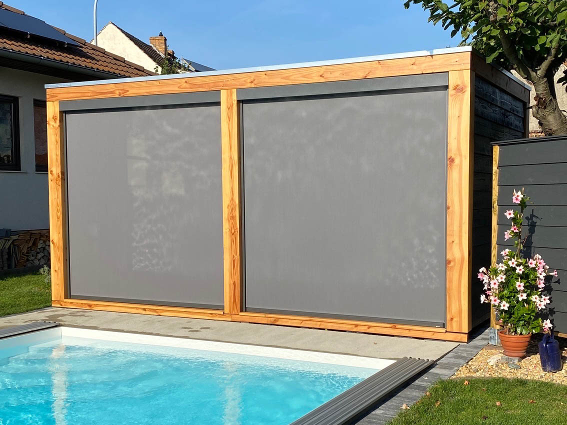 Morgens oder in den späteren Nachmittagsstunden ist der Einfallswinkel wärmender Sonnenstrahlen recht flach. Die wohlige Wärme wird so zum blendenden Ärgernis. Überdachungen oder Sonnenschirme allein werden dieser Herausforderung nicht gerecht. Mit einer Senkrechtmarkise sind Sie jedoch bestens gewappnet. Das Tuch der Senkrechtmarkise ist halbtransparent. So spendet sie Schatten und erlaubt dennoch den Ausblick in den Garten. Sie lässt sich stets so weit senken, dass kein Blendlicht auftritt & entspannten Gesprächen auf der Terrasse oder am Pool nichts mehr im Wege steht. Die Senkrechtmarkise wird inkl. einer Schutzkassette geliefert. Somit kann sie auch an Konstruktionen, bspw. aus Holz, montiert werden, die nicht für den Einsatz von integrierten Senkrechtmarkisen vorbereitet sind.