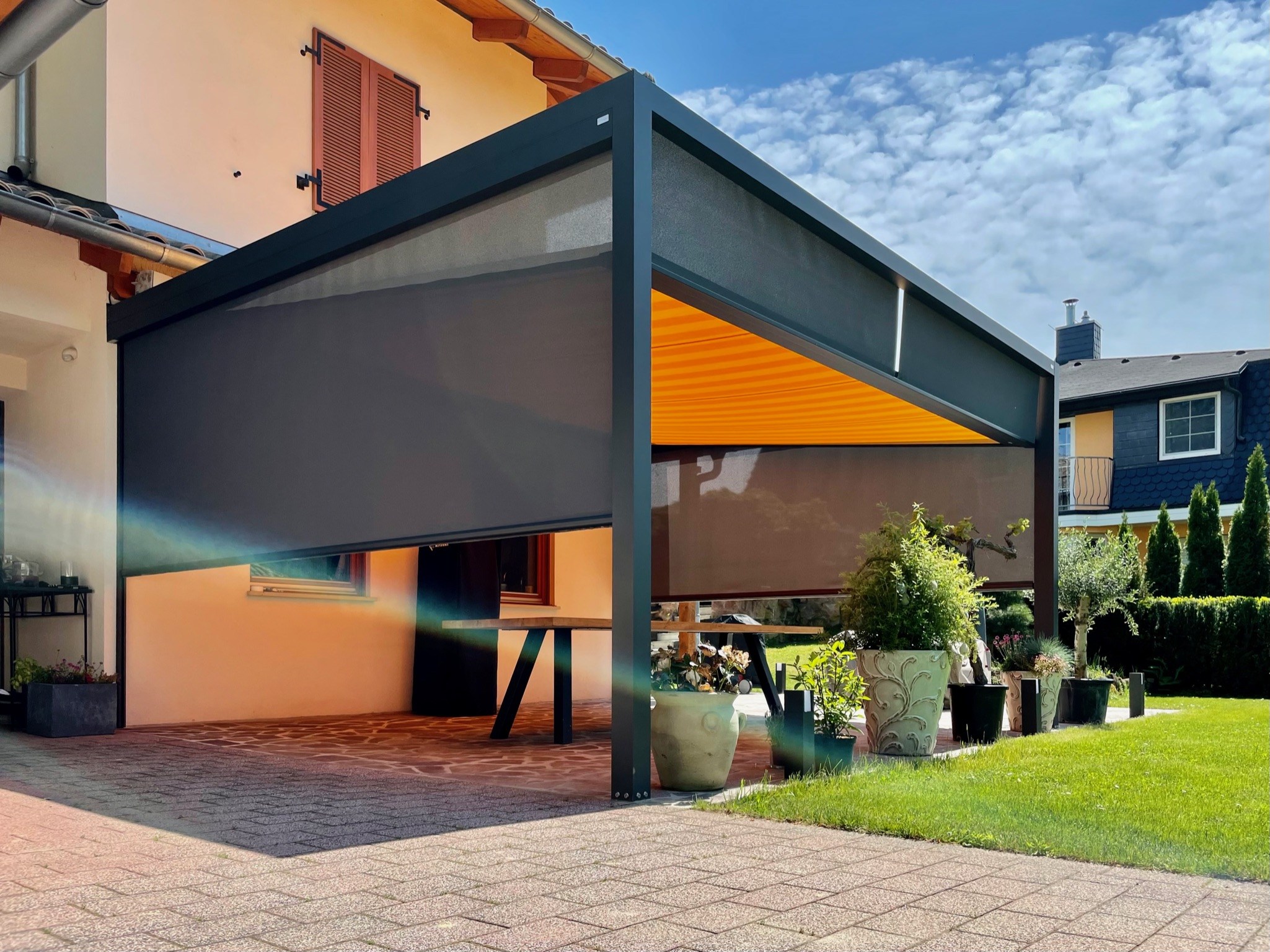 - Pergolamarkisen mit integrierten Senkrechtmarkisen