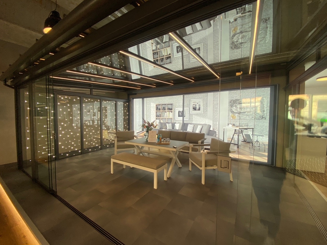 - Terrassendach mit Glaseindeckung, Glas-Schiebeelementen und LED Beleuchtung