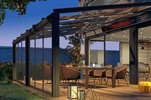 - Terrassendach mit Glaseindeckung, Glas-Schiebeelementen und LED Beleuchtung