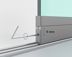- Höhenjustierung im eingebauten Zustand: Alle Schiebeflügel lassen sich im eingebauten Zustand in der Höhe um 4 mm justieren. Somit ist eine Feinjustierung der Flügel nachträglich jederzeit möglich und dadurch sehr montage- und wartungsfreundlich.
