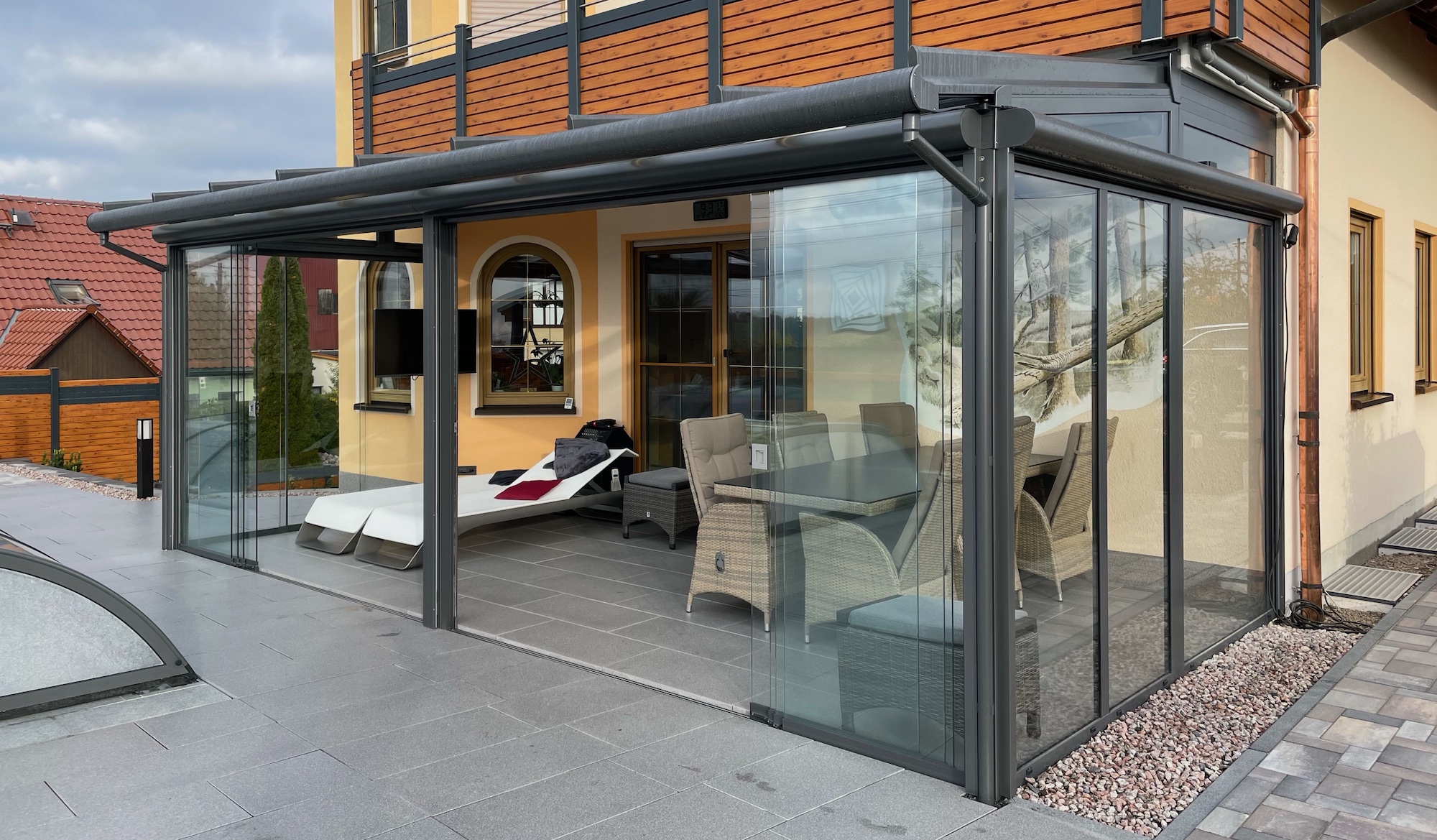 Wenn es richtig Sommer ist, sind wir am liebsten draußen. Eiskaffee und Erdbeerkuchen auf der Sonnenterrasse. Beim erfrischender Aperol Sprizz die sanfte Sommerbrise auf der Haut spüren. Eine intelligente Terrassenüberdachung schafft die perfekte Mischung aus Licht und Schatten für Ihr individuelles Wohlfühlambiente draußen. Mit einem großzügigen Terrassendach kreiieren Sie einen attraktiven Außenraum, der zum Verweilen und entspannten Genießen einlädt. Unter Ihrer komfortablen Terrassenüberdachung sitzen Sie an lauen Sommerabenden lange in fröhlicher Runde im Freien. Bestaunen Sie den faszinierenden Sternenhimmel in romantischer Zweisamkeit durch Ihr gläsernes Terrassendach. Mit Schiebetüren und zusätzlichen Wand-Modulen verwandeln Sie Ihre Terrasse schnell in einen behaglichen Wintergarten, wenn ein Gewitterregen oder der stürmische Ostwind unvermittelt die Gartenidylle stören. Empfindliche Pflanzen und Gartenmöbel sind bis weit in den Herbst vor kühleren Temperaturen und Wetterkapriolen aller Art sicher geschützt. Mit Heizpilz, Wintergrill und Glühwein sorgt ein gutes Terrassendach mit Ergänzungselementen auch in der kalten Jahreszeit für echten Outdoorspaß und unvergessliche Winterfeste und steigert den Wert Ihrer Immobilie. Nur in besonders eisigen Wintern müssen Sie sich in unseren Breiten eine Alternative für Ihre empfindlichen Pflanzen und Ihre Orangen- und Olivenbäumchen überlegen.